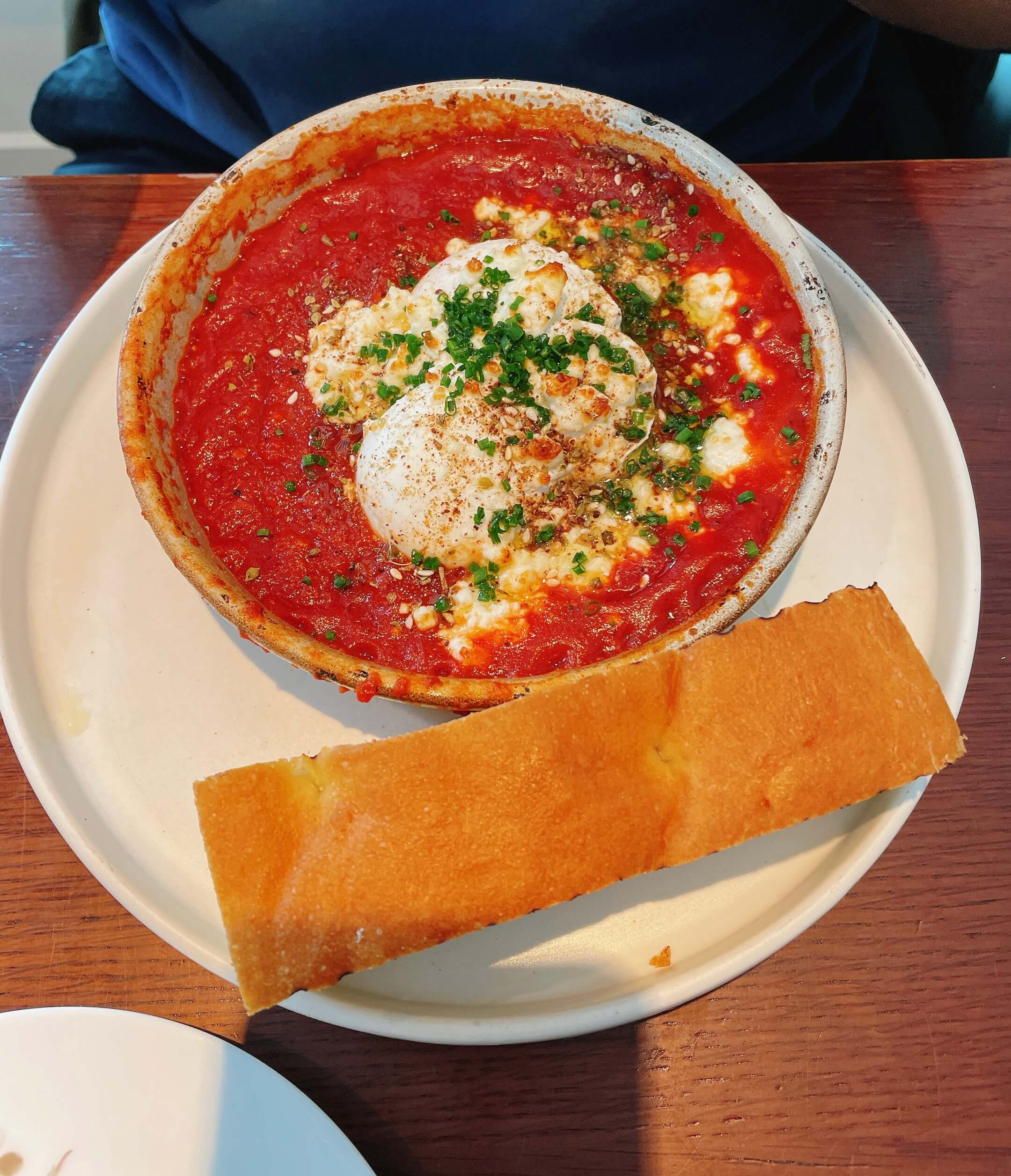 這個是SHAKSHUKA(北非蛋),也是許多人會點的,是一道經典的北非及中東風味料理,要沾著旁邊的麵包一起吃。
