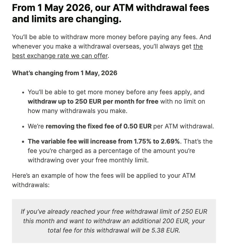 ATM提款從每個月免費提領200歐元提升到250歐元,不限提領次數。